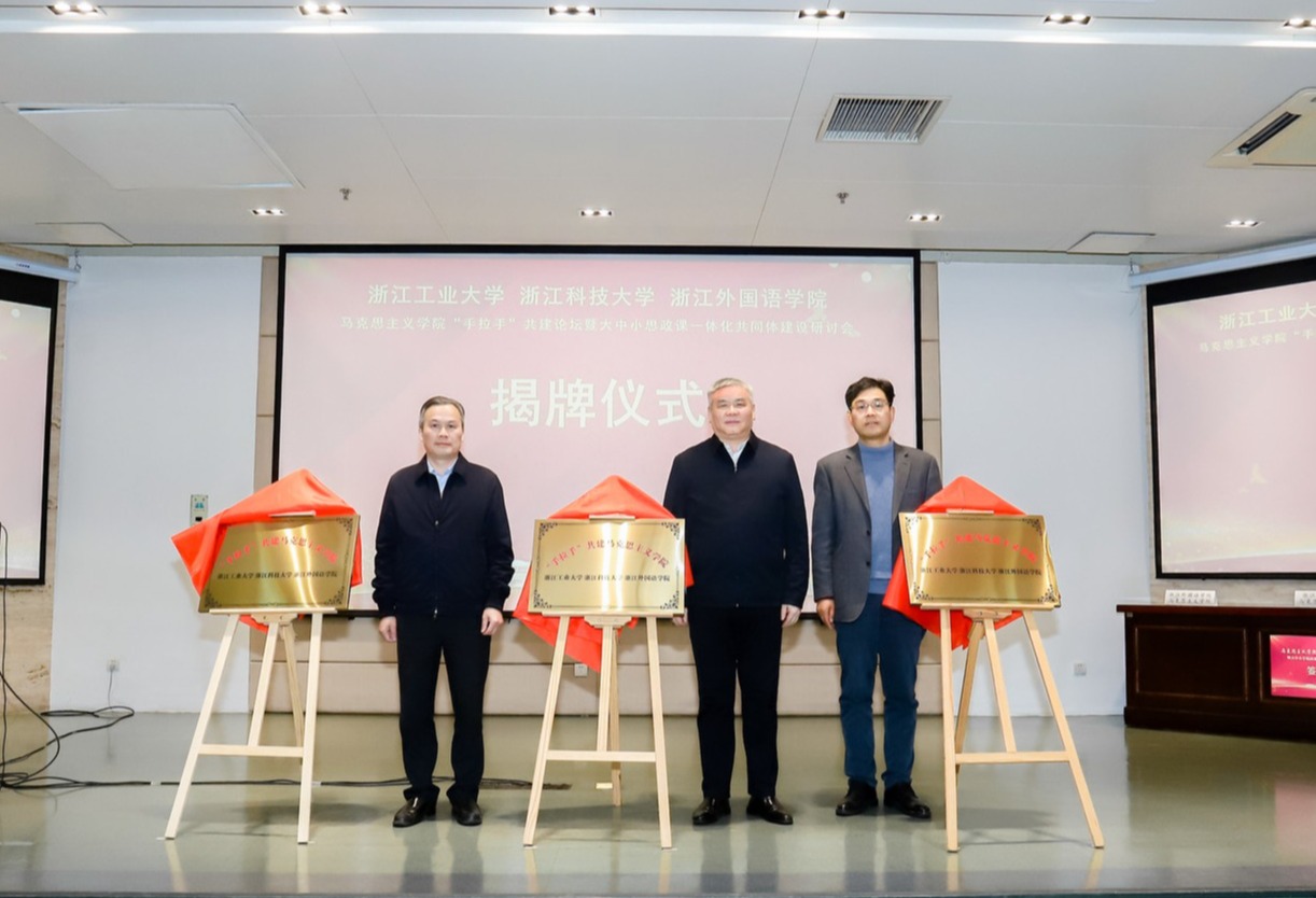 12月30日,在杭高校马克思主义学院“手拉手”共建联盟启动仪式暨大中小学思政课一体化共同体建设研讨会举行。会上,我校党委副书记单胜道和浙江工业大学党委副书记陈杰、浙江外国语学院党委副书记赵文波共同为“手拉手”共建马克思主义学院揭牌。三所高校马克思主义学院负责人共同签署了“手拉手”共建联盟协议,并为思想政治理论课实践导师颁发聘书。