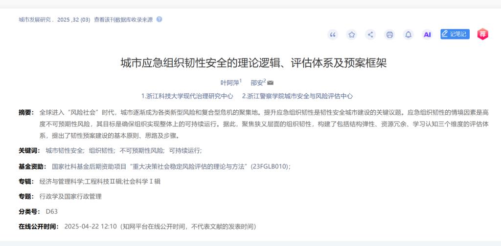 主要内容:全球进入“风险社会”时代,城市逐渐成为各类新型风险和复合型危机的聚集地。提升应急组织韧性是韧性安全城市建设的关键议题。应急组织韧性的情境因素是高度不可预期性风险,其目标是确保组织实现整体上的可持续运行。据此,聚焦狭义层面的组织韧性,构建了包括结构弹性、资源冗余、学习认知三个维度的评估体系,提出了韧性预案建设的基本原则、思路及步骤。本文将韧性理论系统性地应用于组织层面,构建了逻辑自洽的“理论逻辑-评估体系-预案框架”三层结构;突破了传统以“投入-产出”为主的评估模式,建立了涵盖“结构-资源-学习”三维度的量化评估指标体系,使“韧性”变得可衡量、可比较;提出了“韧性预案”的概念与框架,强调预案的灵活性、场景化和学习反馈功能,使其成为动态更新的“活文件”,而非束之高阁的“死文本”。
